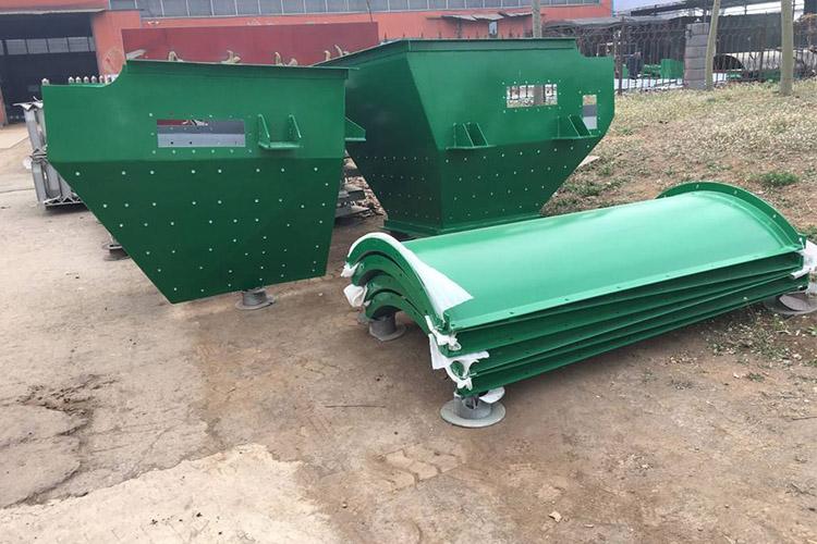 導料槽可分為加防溢裙板型和全封閉型;如果是全密封型,由上中下三部分組成,中間側板與輸送機機架連接,為固定部分,上頂蓋及下底板分別同側板通過螺栓連接,可很方便的進行拆卸,以便安裝和維修。